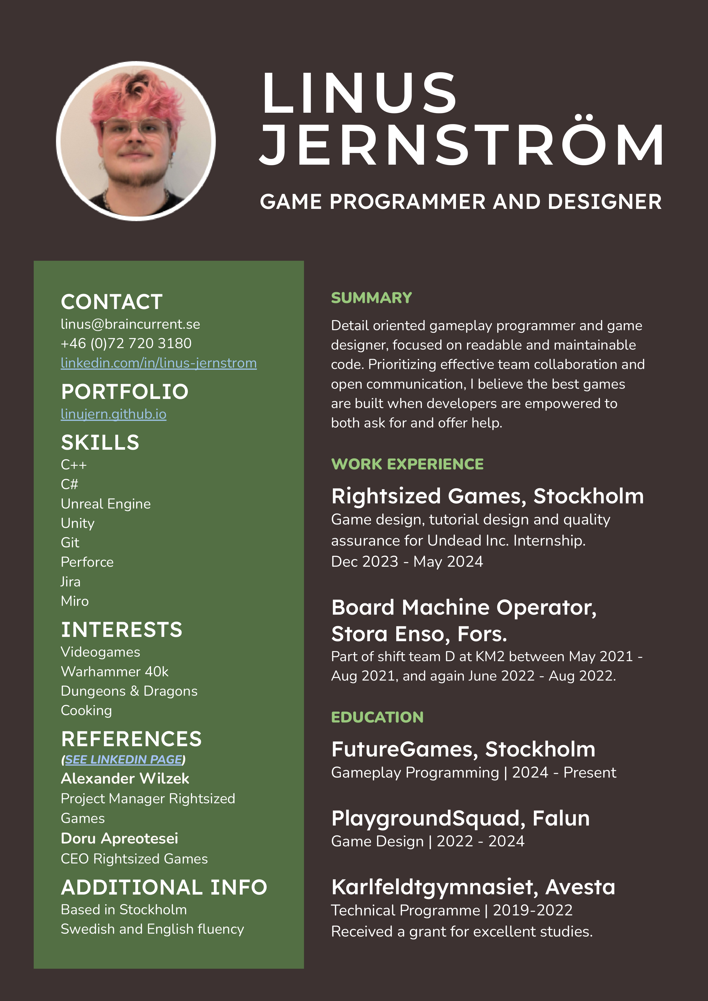 "Linus did his internship with us at Rightsized Games and was very helpful, completing both QA and game design tasks on time and to spec. I would recommend him for any junior game design role."